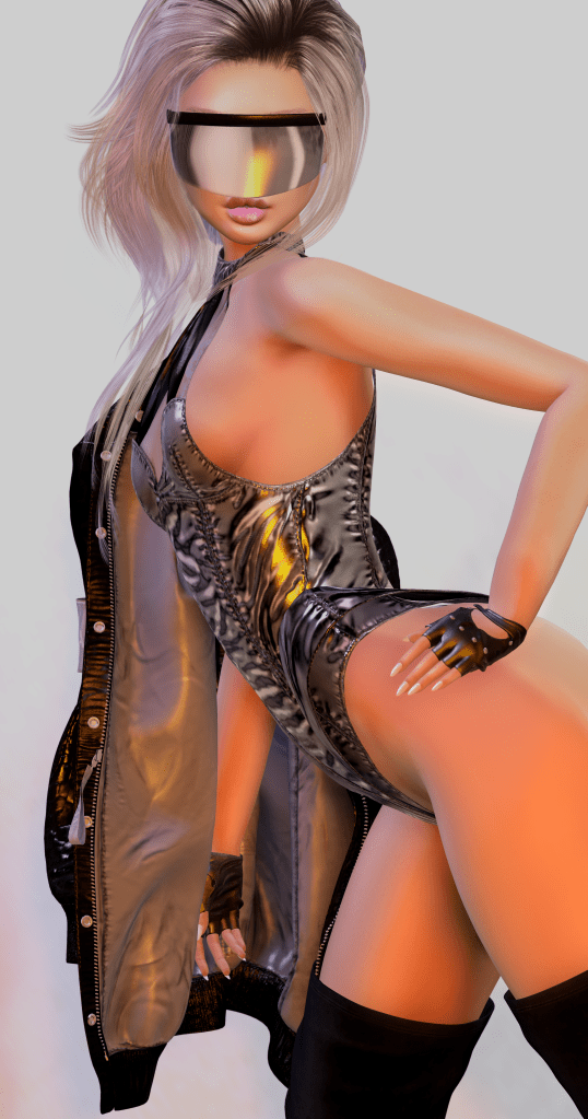 D I R A M – ZIVA, UniSex SunGlasses in Chrome, ZIVA Bodysuit, ZIVA Blouson/Shoulder Jacket in Croco Black.
