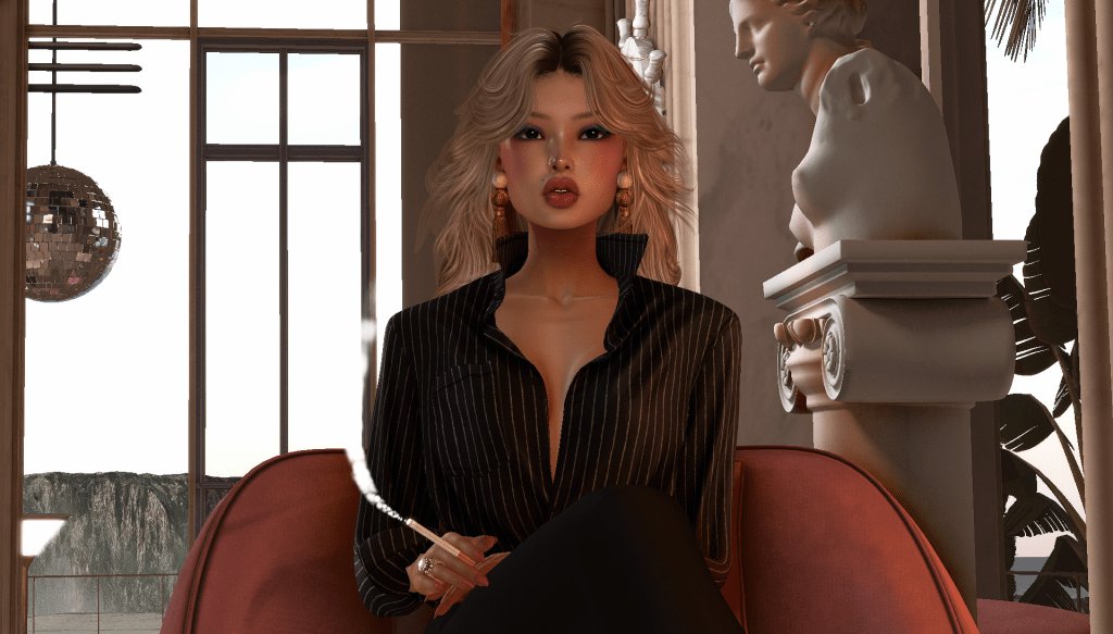 Then at David Heather’s main store I found the Ilaria Blouse – pinstriped, structured, unapologetically severe, waited without ceremony. I didn’t browse. I selected. On its own, the hair felt like a stranger striking, but unmoored. The blouse gave it context. The neckline lent it purpose and the shoulders, broad, architectural, held the entire composition in place. It was power dressing with no need for applause. The kind of silhouette that doesn’t ask for attention. It assumes it.